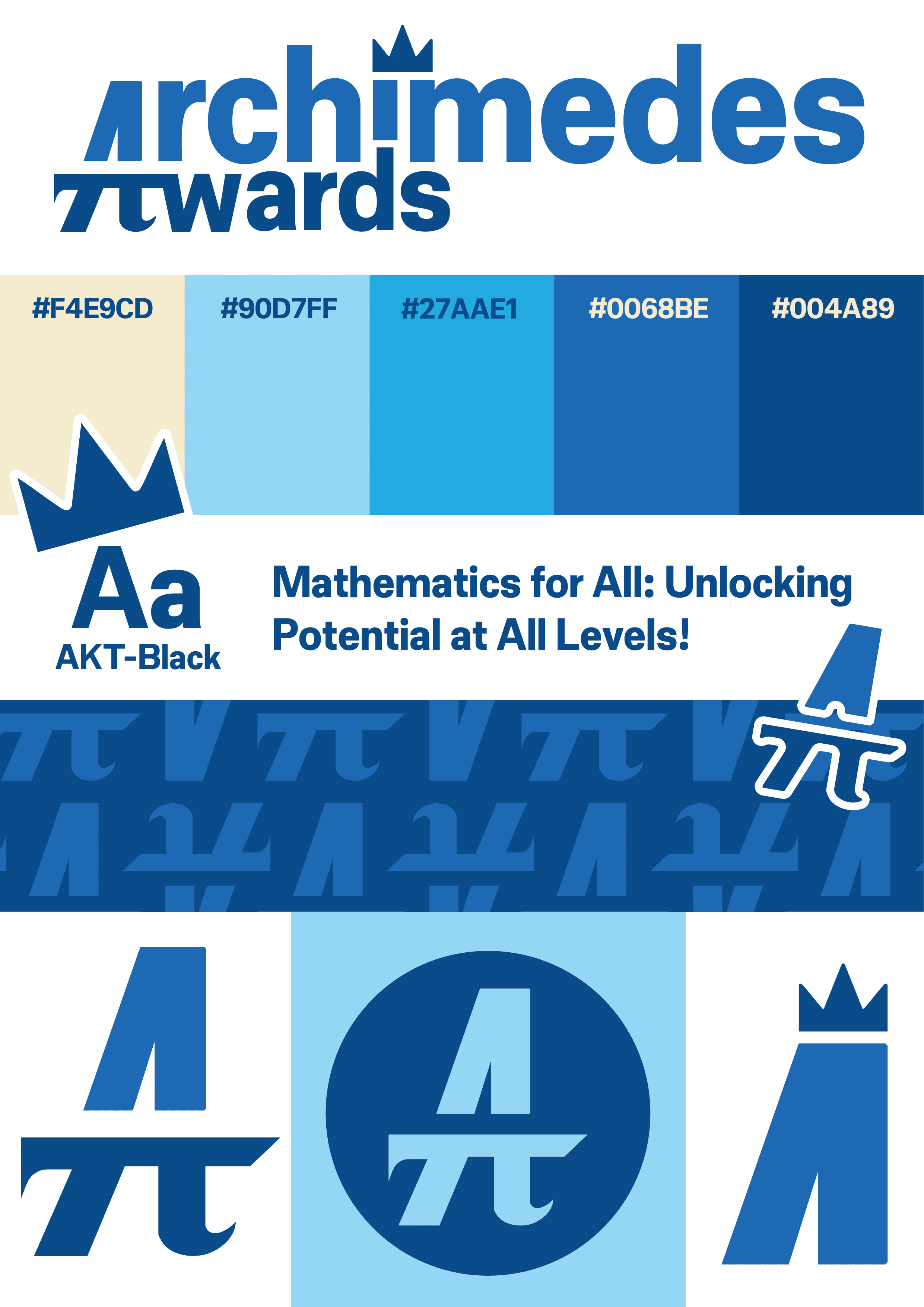 The inspiration behind the brand is the mathematician, Archimedes, who Archimedes Awards wanted reflected in the brand design. To do this, I designed the primary ‘A’ to include the symbol for pi (as Archimedes was the first to calculate the value of pi), as well as a little crown above the word ‘Archimedes’, as a nod to his theory of displacement.